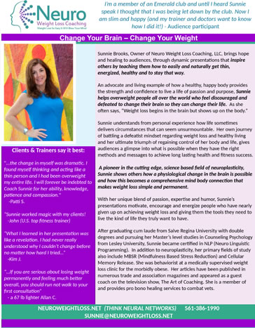Invite motivational speaker and neuroplasticity coach Sunnie Brooks to present her signature presentation to your members, patients, clients, and employees: "Change Your Brain - Change Your Weight " and transform the lives of your members who struggle with weight loss and with living a healthy lifestyle.