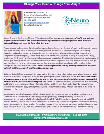 Invite motivational speaker and neuroplasticity coach Sunnie Brooks to present her signature presentation to your members, patients, clients, and employees: "Change Your Brain - Change Your Weight " and transform the lives of your members who struggle with weight loss and with living a healthy lifestyle.